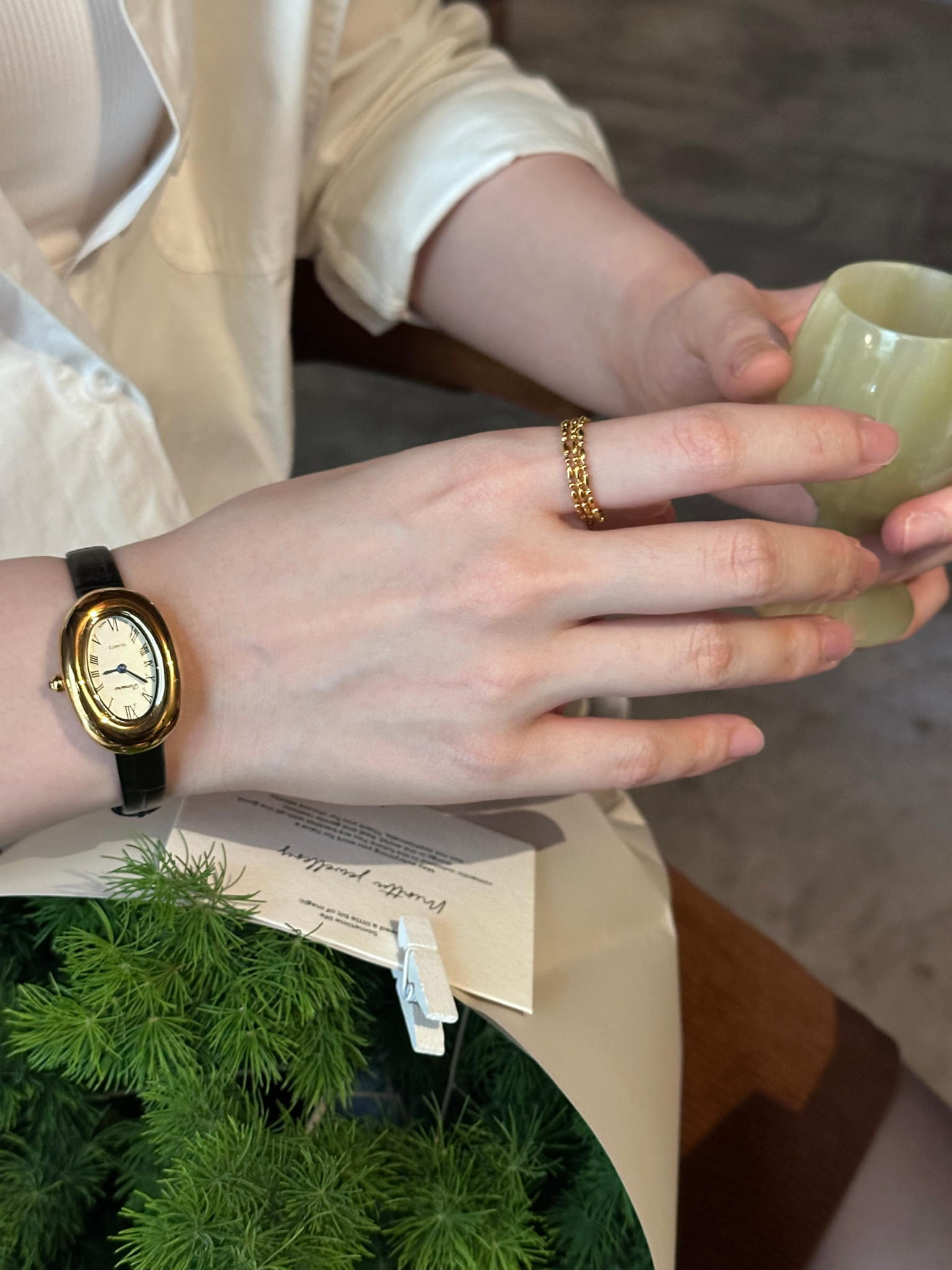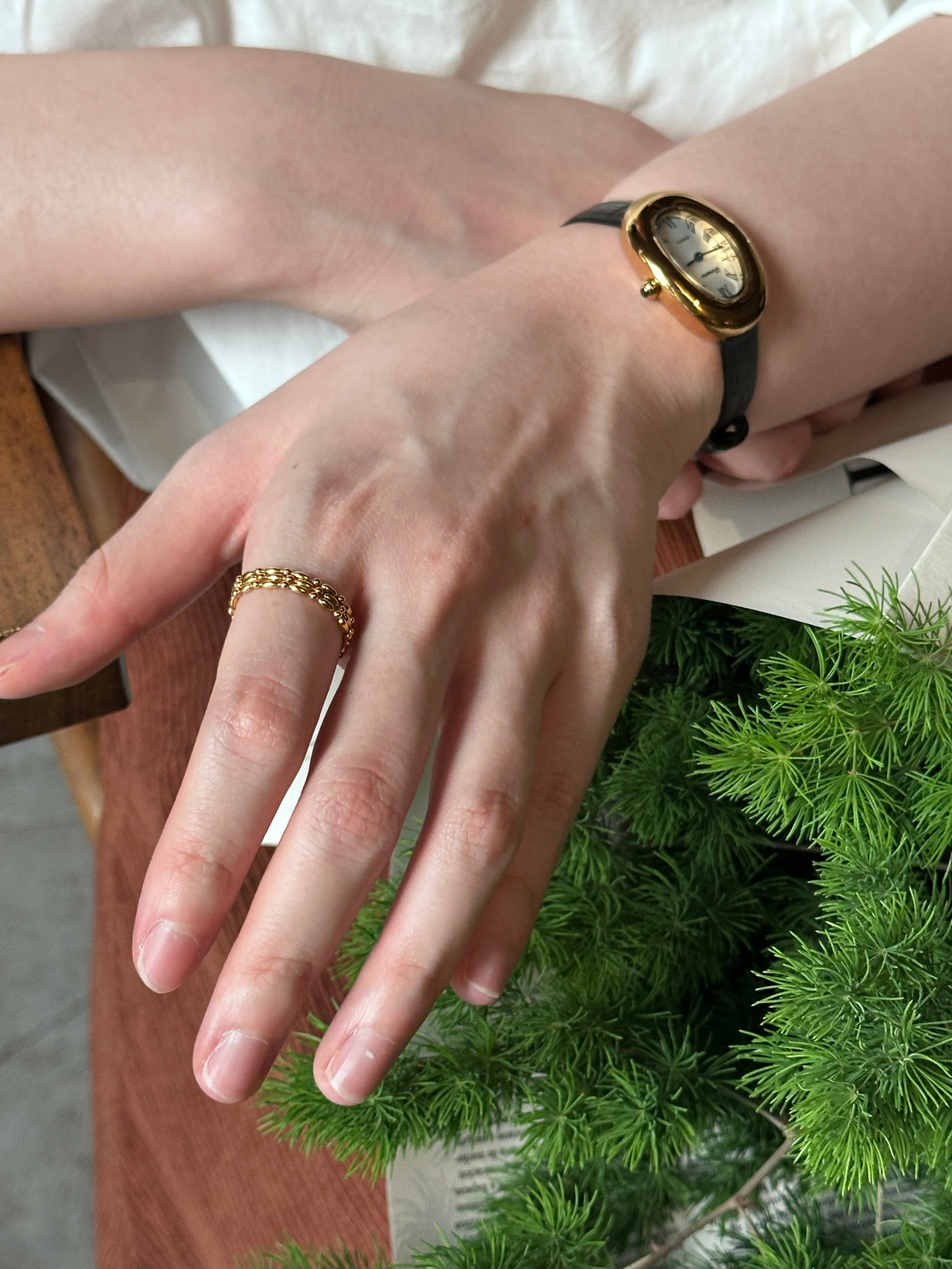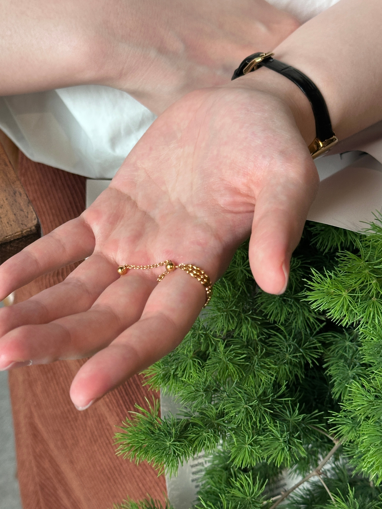它是三层小链条连接在一起。戴上去会多一点层次感和设计感。但整体还是很简约,不会显得太夸张。这款是钛钢材质,日常佩戴会比较省心。而且后面做的是抽拉式调节设计。可以根据自己的手指自由调整大小。戴食指、中指或者无名指都可以。所以平时搭配其实会很方便。三层链条叠在一起,看起来会比普通戒指更有一点设计感。是一款日常戴也很好看的戒指。