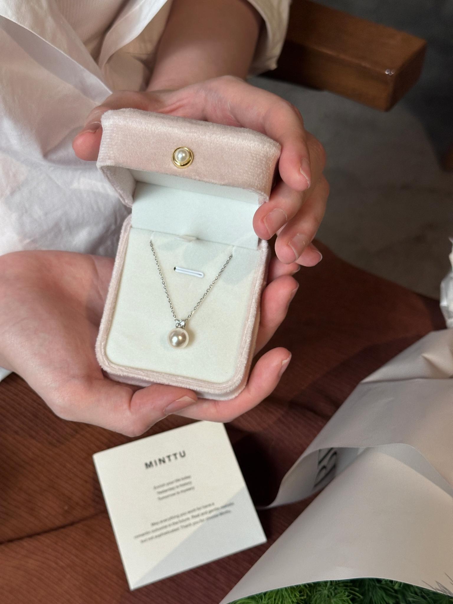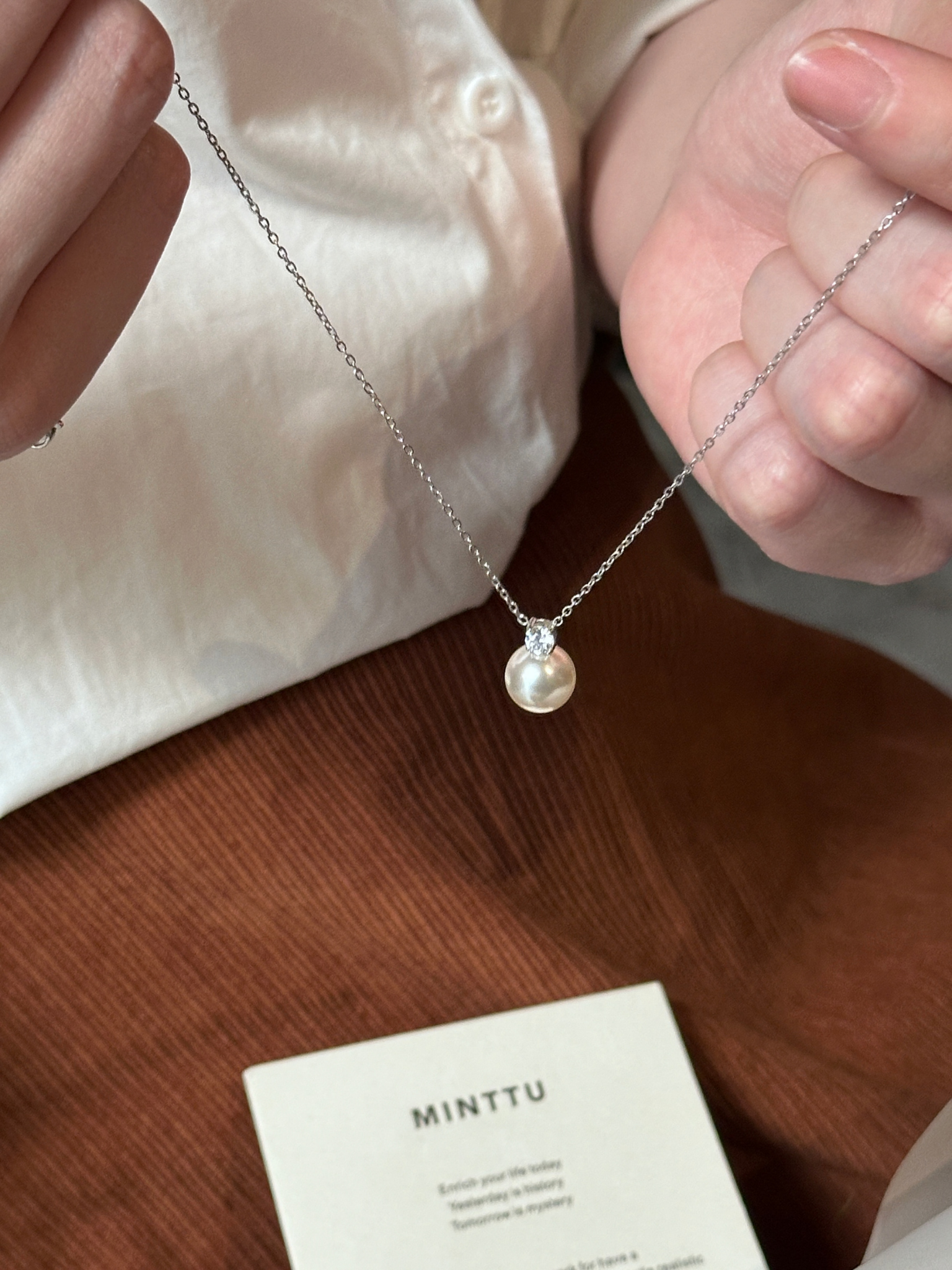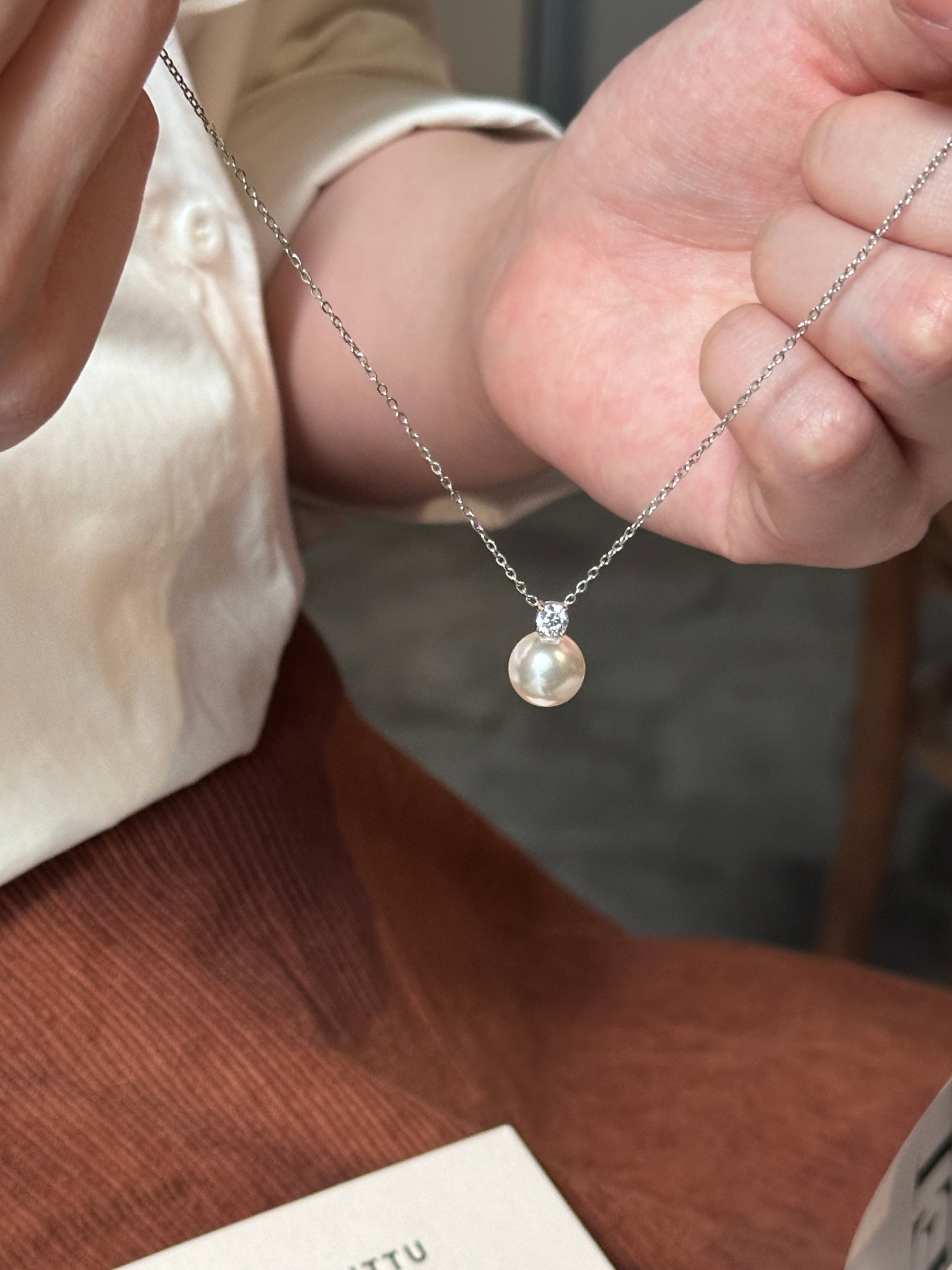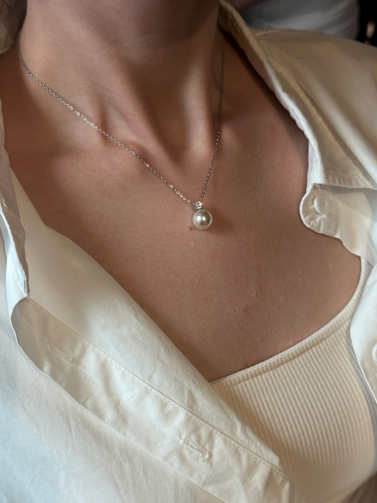 这款小灯泡珍珠项链没有很多复杂的设计,就一颗圆圆的珍珠,刚好落在锁骨中间。很简单,却很耐看。珍珠的上面还有一颗小小的锆石。光线照到的时候会轻轻闪一下,整颗珍珠看起来就像一颗被点亮的小灯泡,那种很温柔的光。戴衬衫、T恤、针织的时候都会有一点点很自然的法式感觉。不是很刻意的精致,但会让整个人看起来更柔和一点。