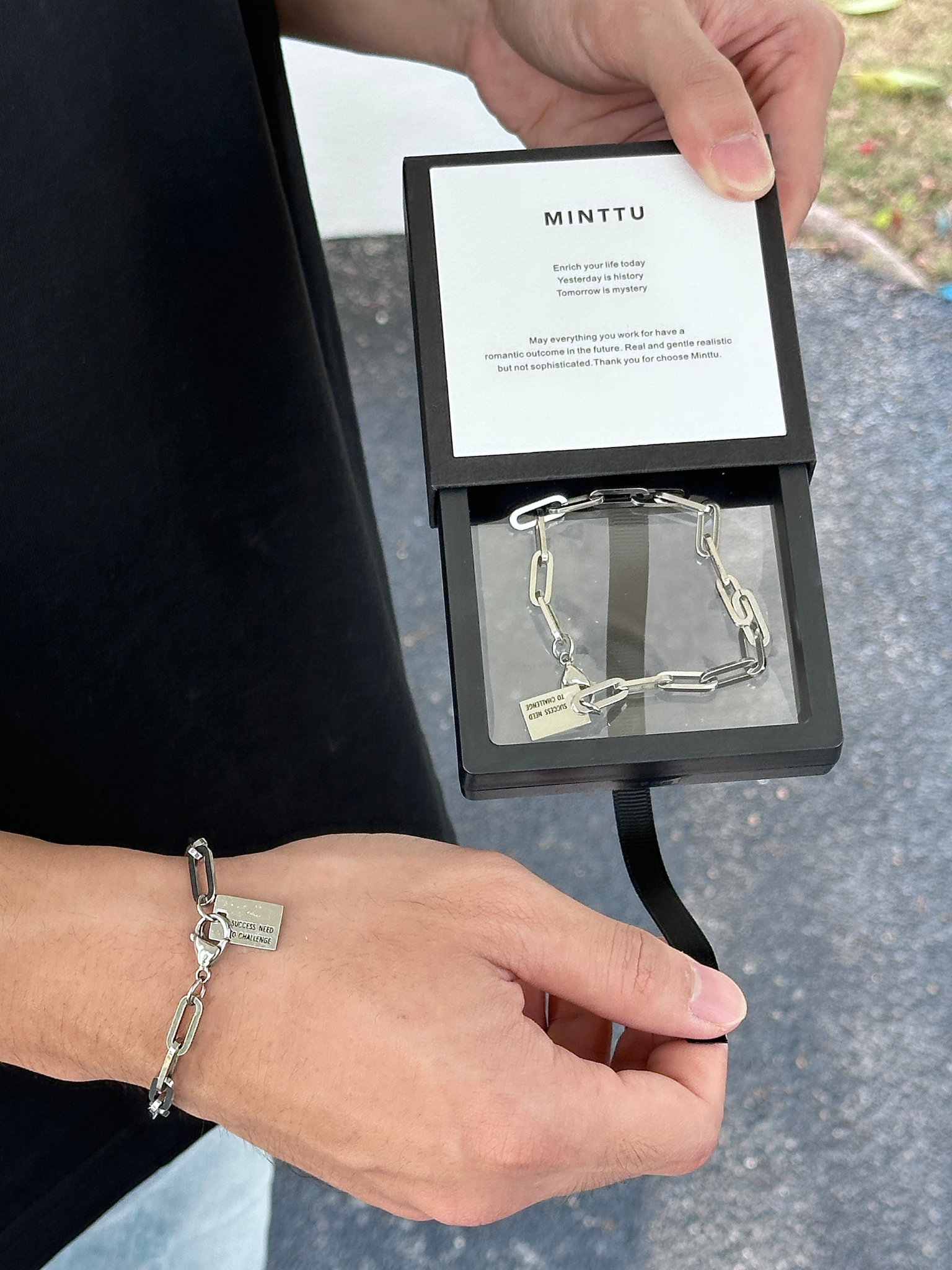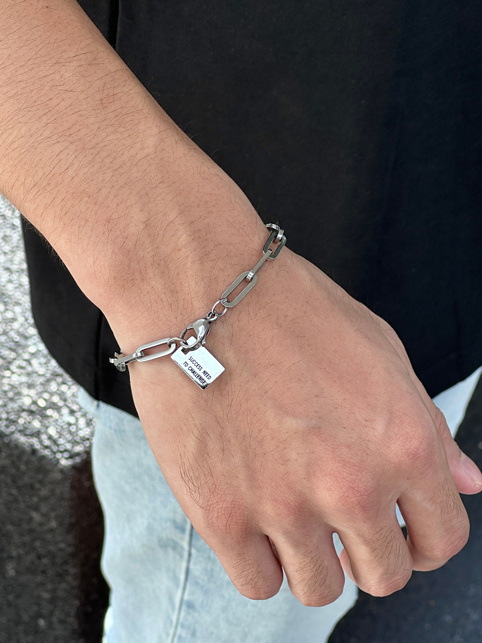 手链通体都是钛钢材质, 洗澡、运动、日常佩戴都没问题, 不怕水、不易氧化,真正做到「戴了就不用管」。吊牌背面可刻字, 名字、日期都可以。送人,自戴,都刚刚好。设计整体低调适合日常佩戴。 利落的链条线条,搭配小方牌设计, 把风格收得很干净
