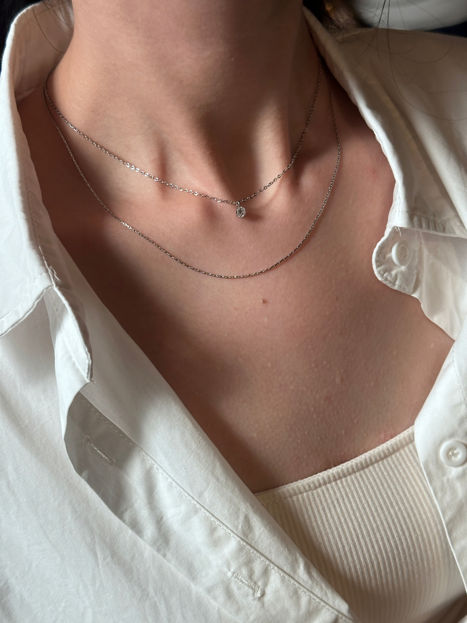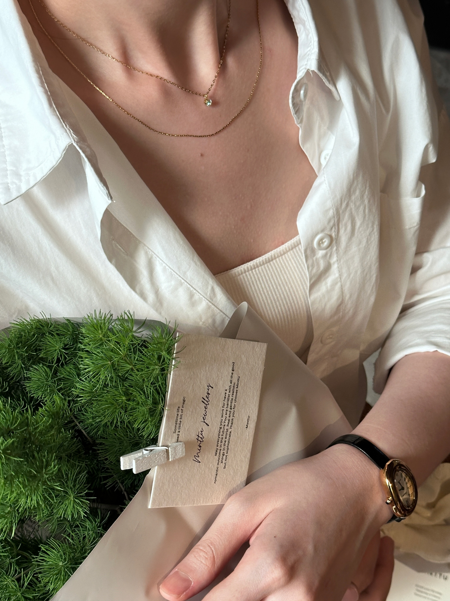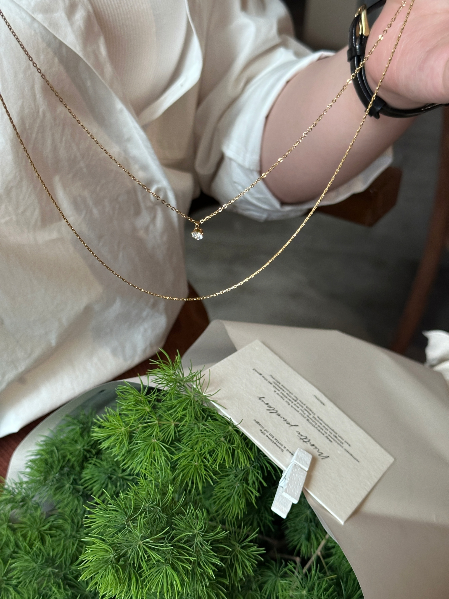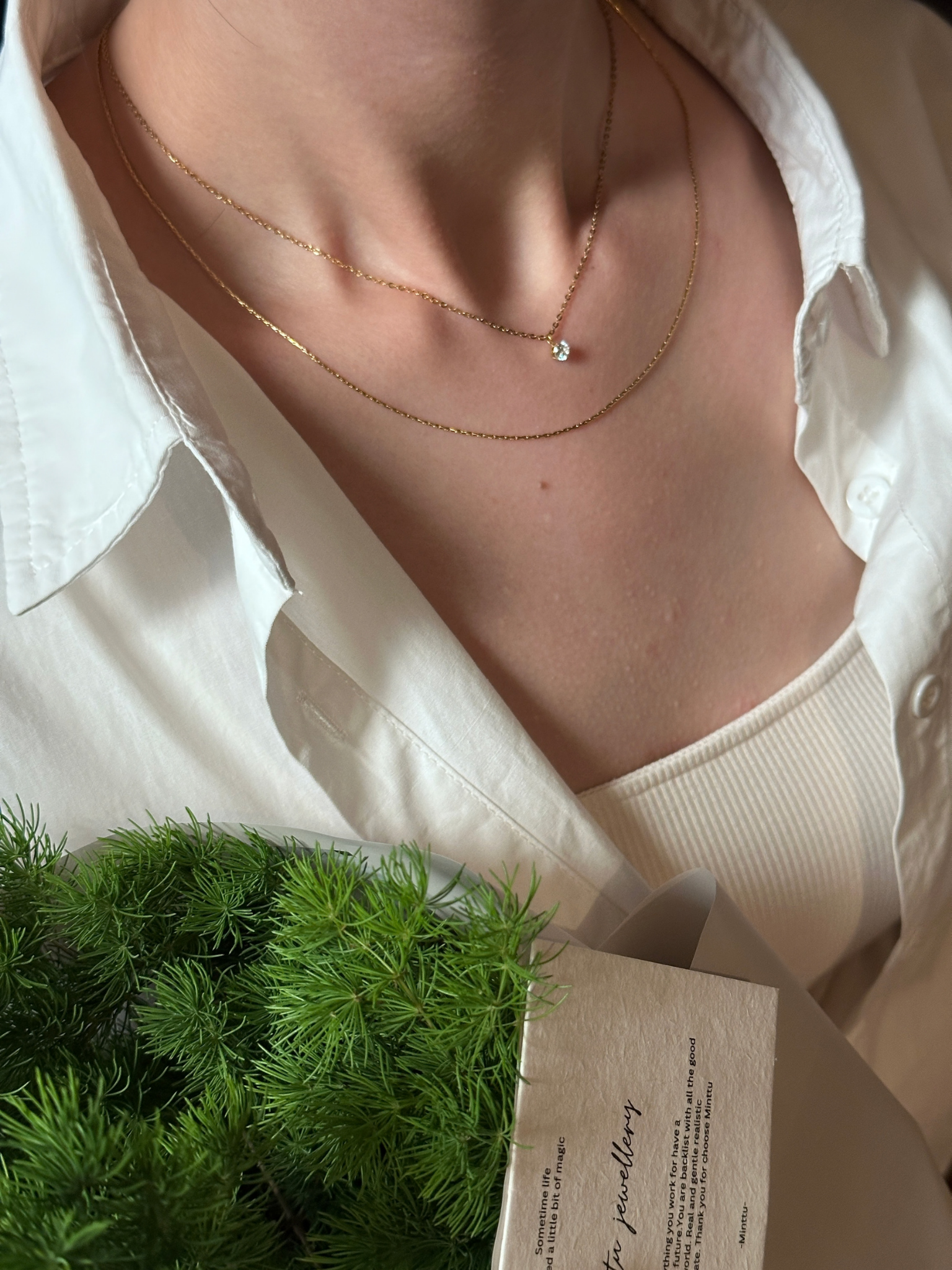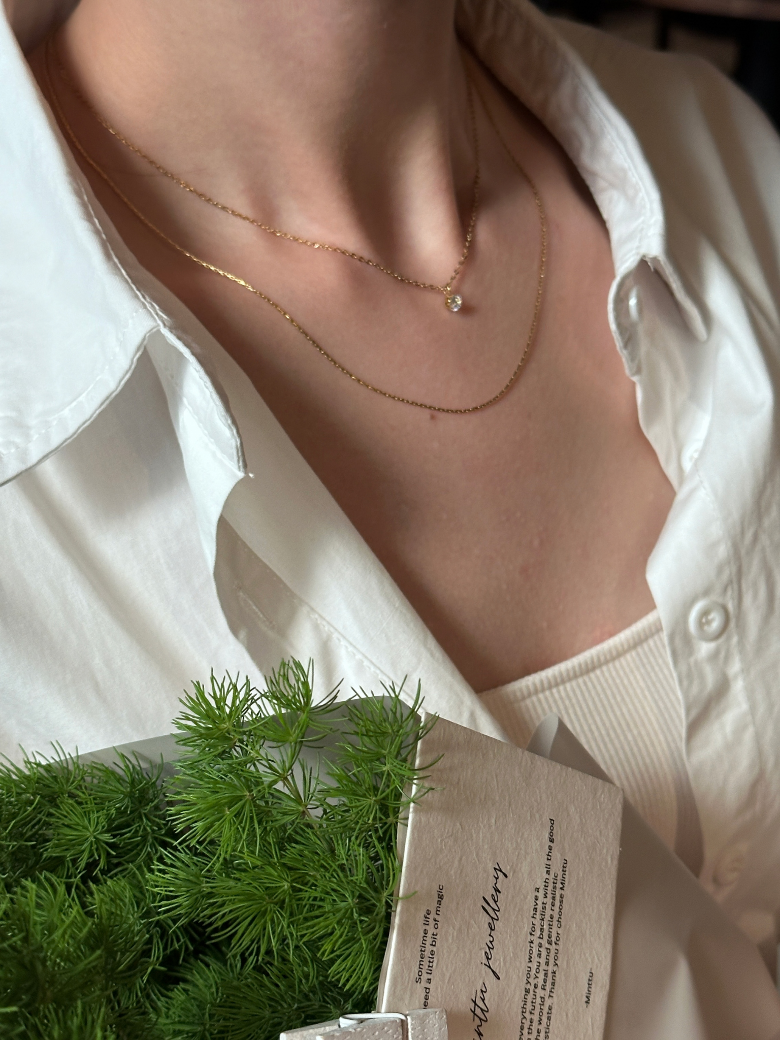 如果出门想要搭配得比较有设计感一点,我通常会选这种双层锁骨链。比起单条项链多了一点层次,但又不会显得太复杂。中间是一颗小小的锆石。光线照到的时候会轻轻闪一下,像是锁骨上偷偷亮着一颗小星星。平时搭衬衫或者小背心都会很好看。简单之中又多了一点精致感。这款是钛钢材质日常佩戴也很省心。洗澡、运动、喷香水都可以直接戴着。而且有金色和银色可以选择,不管喜欢暖调还是冷调都很好搭。如果想要一条比基础款更有设计感一点的项链,这款其实很适合。