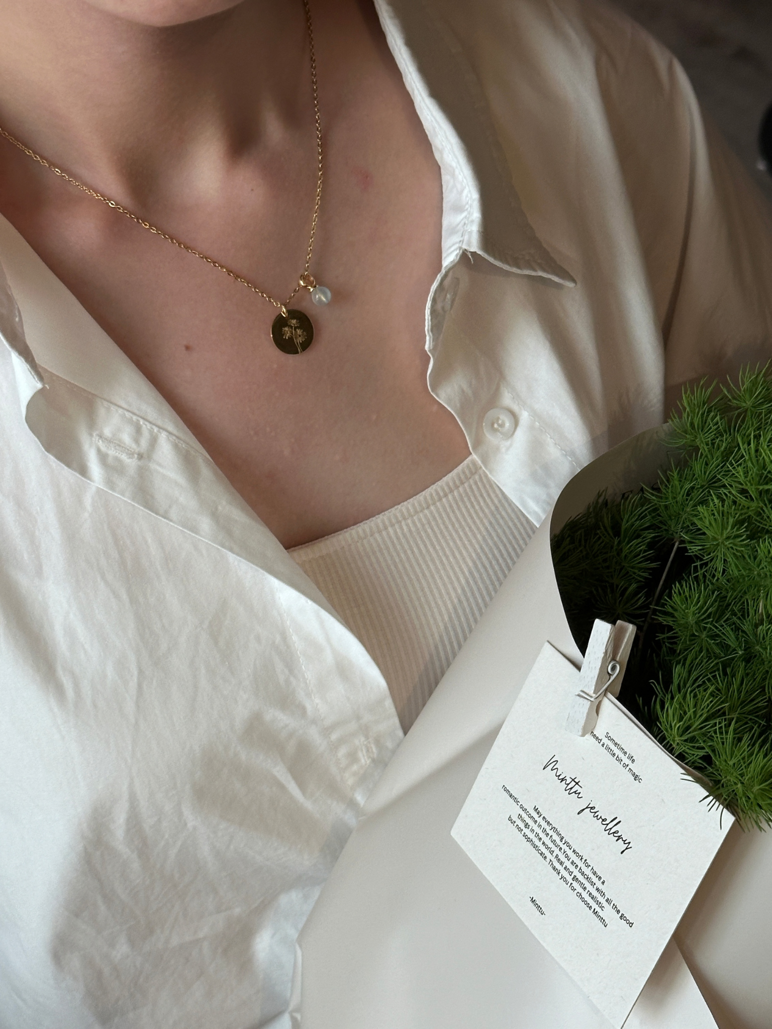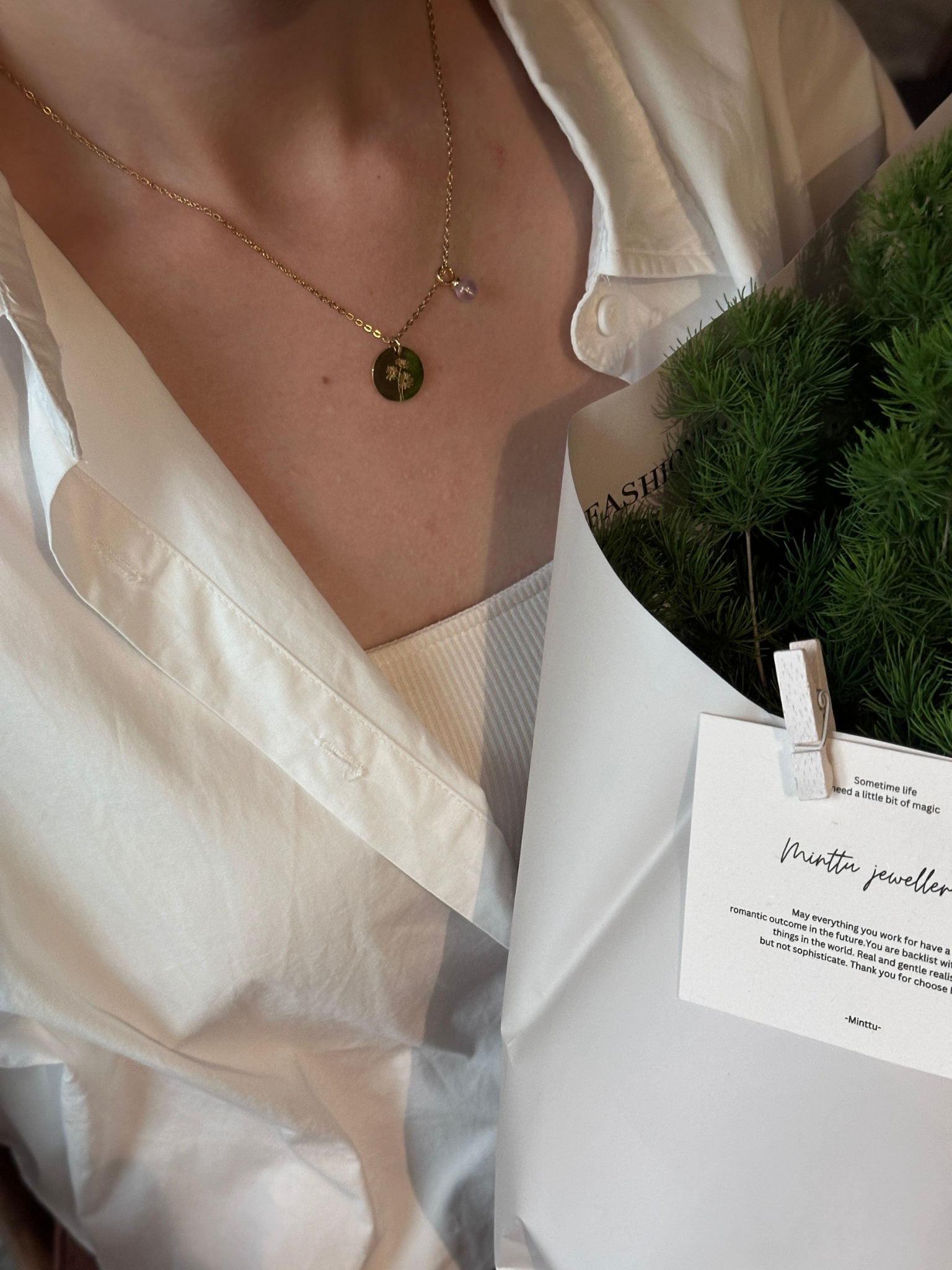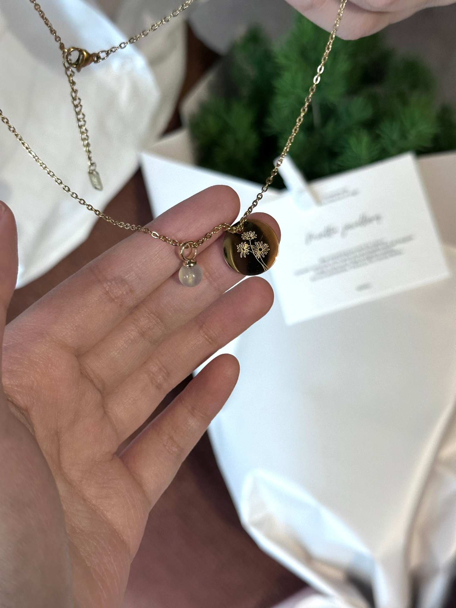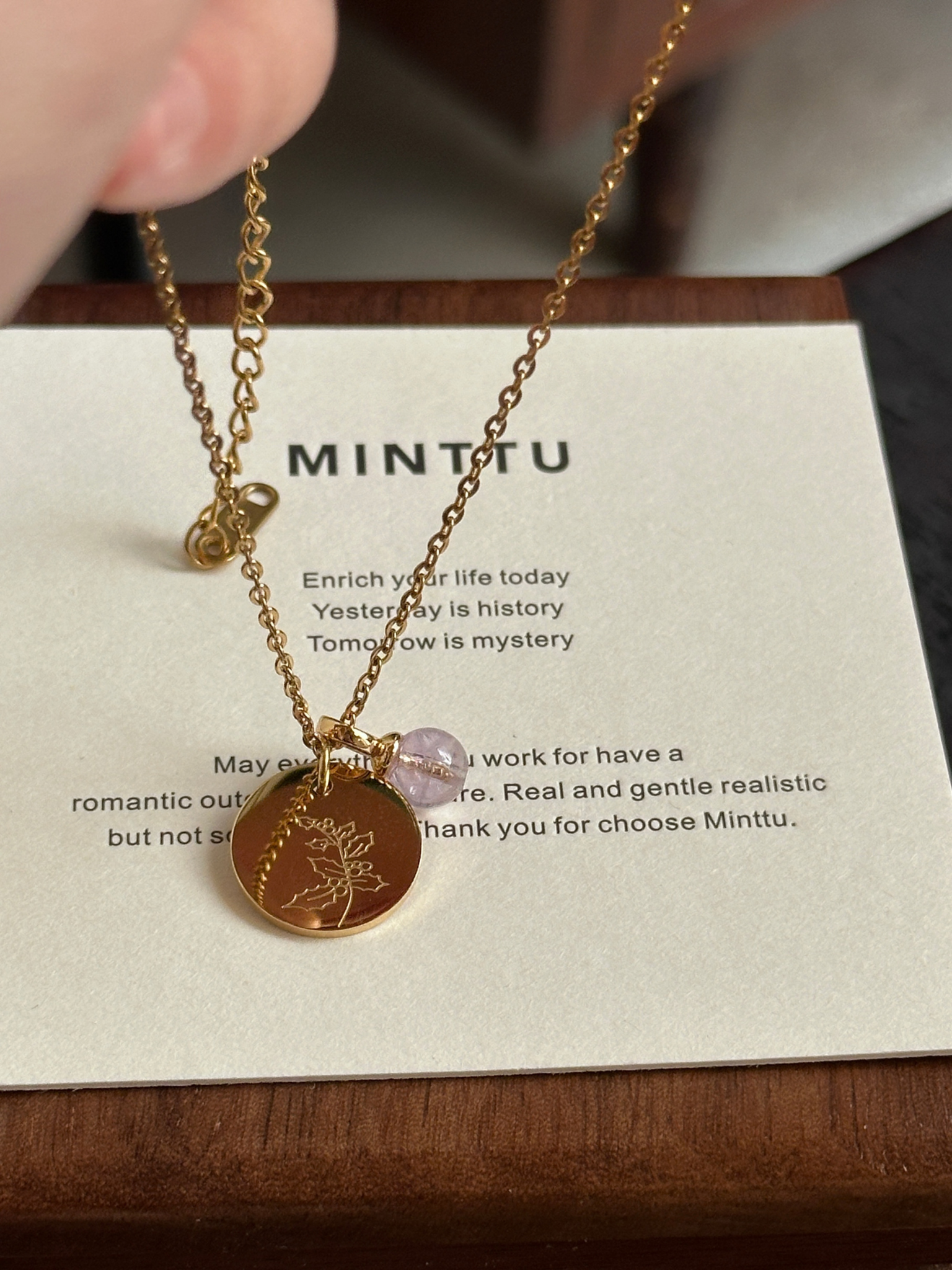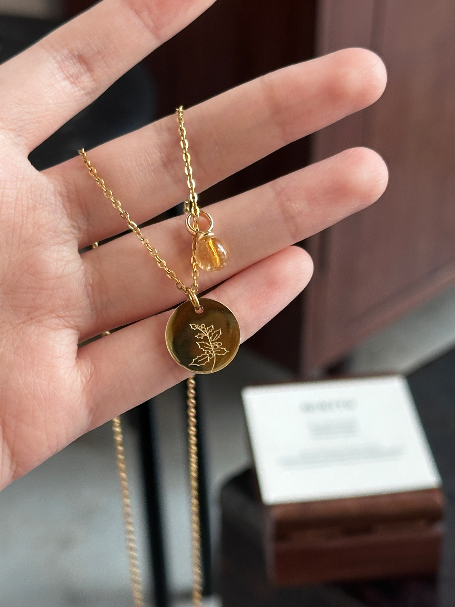 小圆牌上有两种花可以选择:冬青或雏菊。冬青的花语是守护、坚韧和长久的陪伴。如果选择雏菊,它代表的则是纯真、希望和温柔的祝福小小的一枚圆牌,却藏着一份属于自己的花语。圆牌旁边还搭配了一颗天然水晶。可以选择葡萄石、海蓝宝、紫水晶或黄塔晶。这些颜色其实也对应着MBTI人物里的青色、蓝色、紫色和黄色。如果你知道自己的 MBTI人格类型,就可以选一个属于自己的颜色。而且项链的背面还可以刻字。名字、MBTI或者一段有意义的字母。最多可以刻16个字母或数字。所以这条项链其实更像是一条只属于自己的小小标记。不管是送给自己,还是送给朋友,都会是一份很有意义的小礼物。 ✨